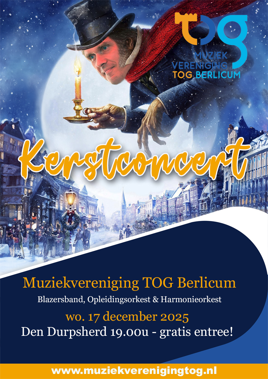 Het kerstconcert van muziekvereniging TOG op woensdag 17 december begint om 19.00 uur, vindt plaats in Den Durpsherd in Berlicum en is gratis toegankelijk voor iedereen.
